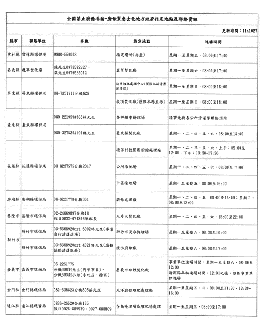 轉知環境部環境管理署公告,自114年10月23日至114年11月22日止,取得廚餘再利用檢核之畜牧場可清運廚餘至所在地環保機關指定之地點,詳如說明。