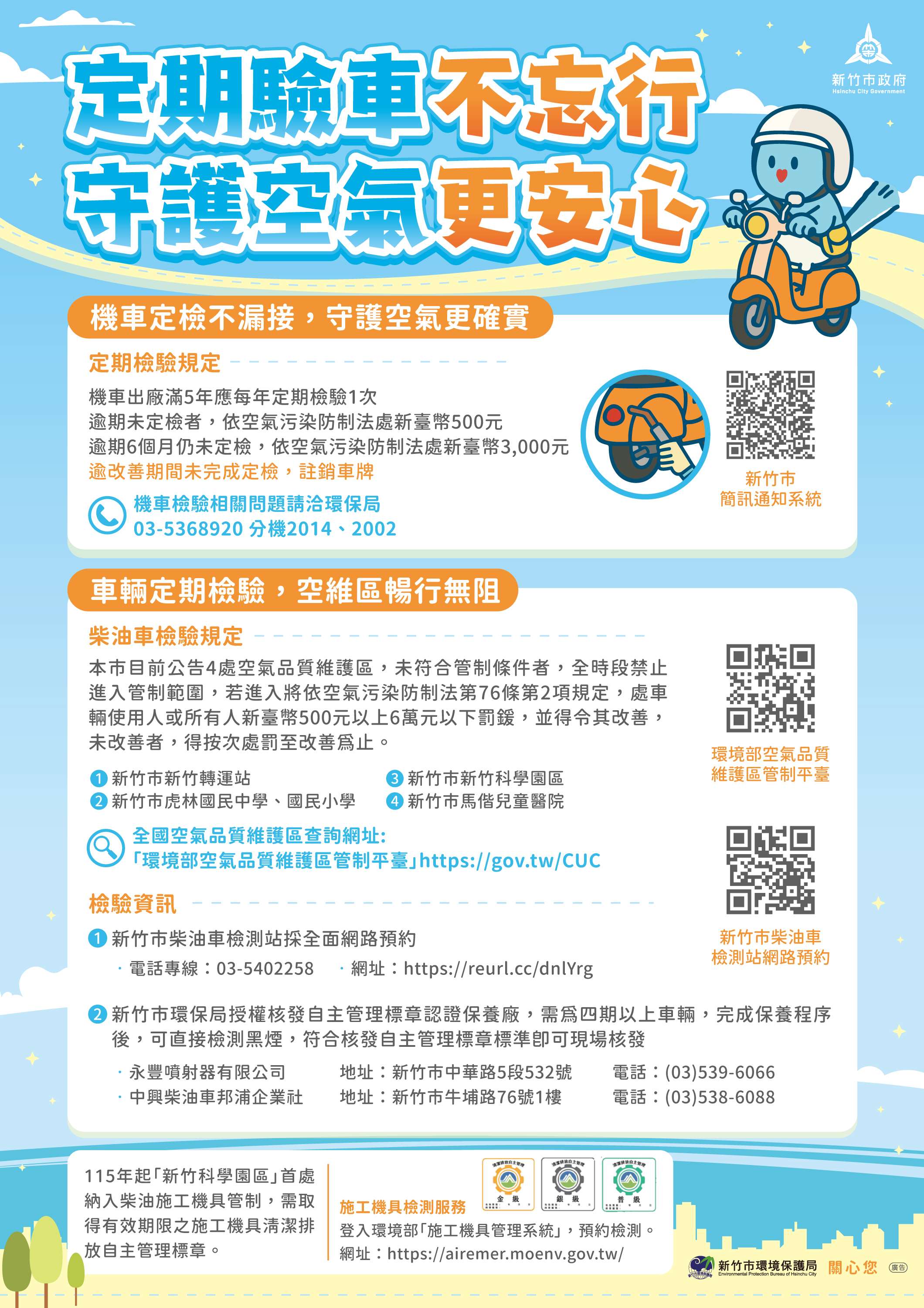二、機車車輛出廠滿五年應每年定期檢驗1次,逾期未定檢者,依空氣污染防制法處新臺幣500元以上1萬5,000元以下罰鍰,最重得註銷牌照。